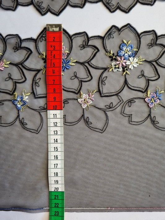 Zwart tule kant met grote zwarte bloemen en kleine vergeet-me-nietjes