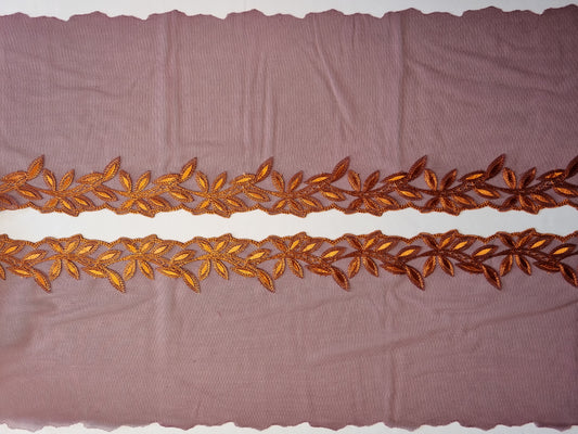 Aubergine tule kant met koper kleurig borduursel