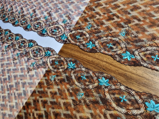 Bruin tule kant met retro print en borduursel in turquoise en bruin