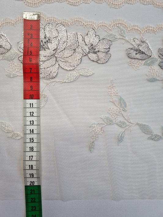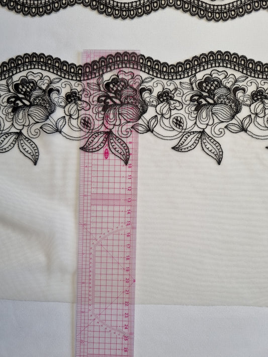 Ivoor wit tule kant met geborduurde retro rozen in zwart