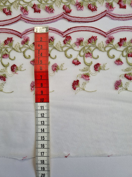 Wit tule kant met kleine bloemetjes in bordeaux en roze