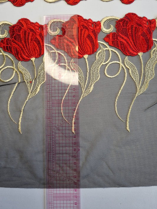 Zwart tule kant met rood geborduurde tulpen