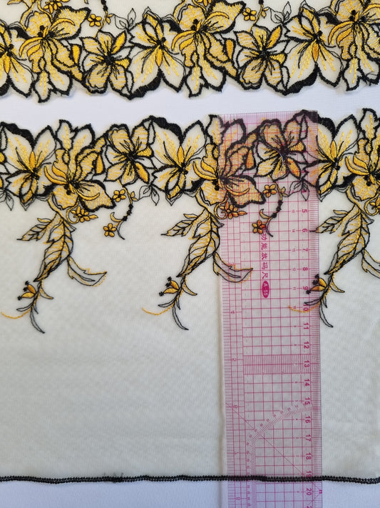 Geel tule kant met zwart en geel geborduurde lelies