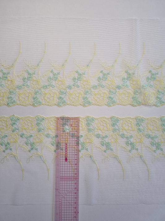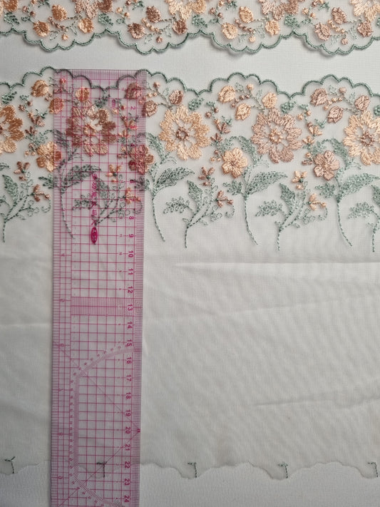 Mint kleurig tule kant met lavendelblauw en wit geborduurde bloemen