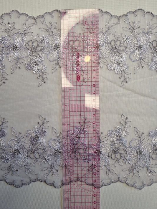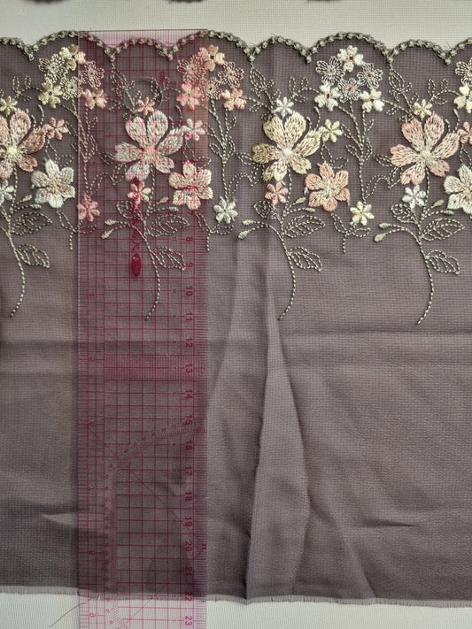 Lavendel kleurig tule kant met geborduurde bloemen in grijs en lavendel tinten