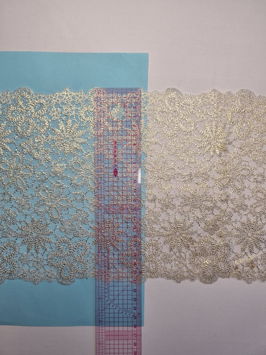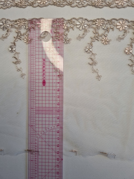 Wit tule kant met borduursel in goudkleurig lurex draad