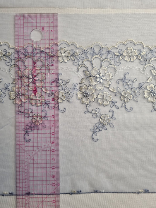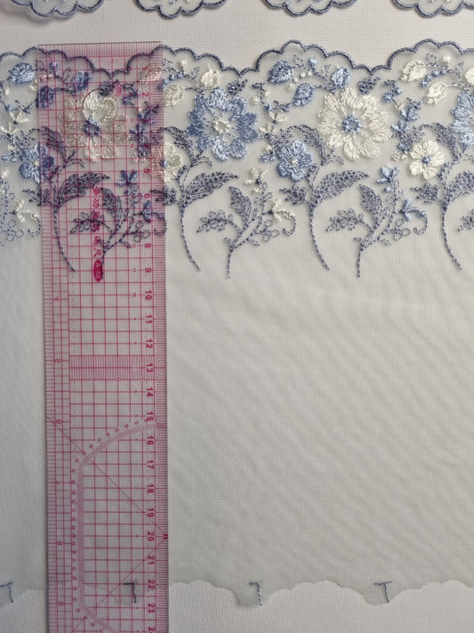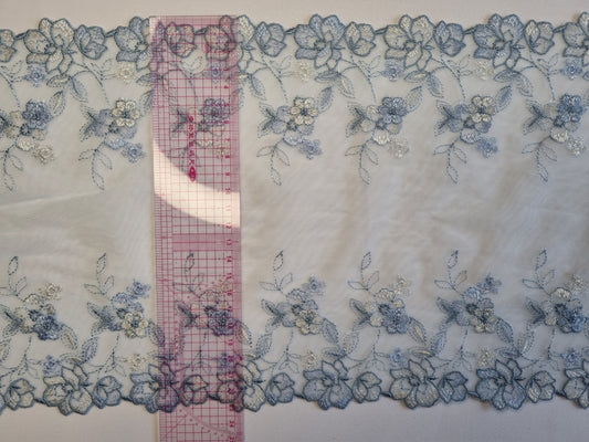 Lichtblauw tule kant met geborduurde bloemen in blauwtinten