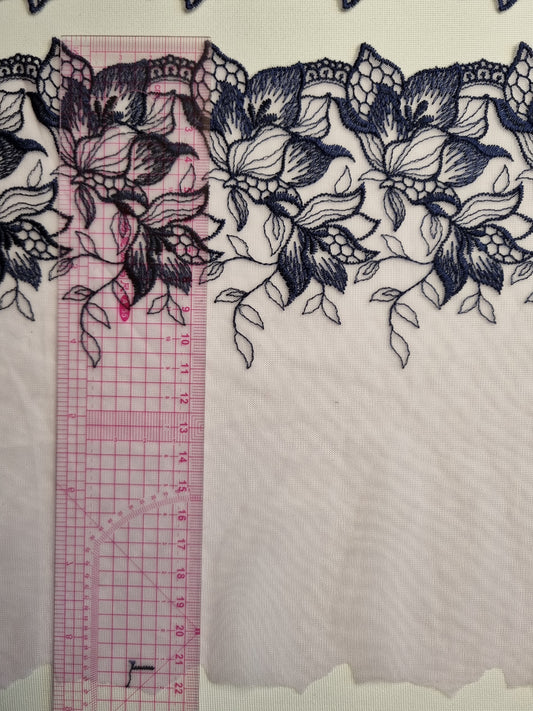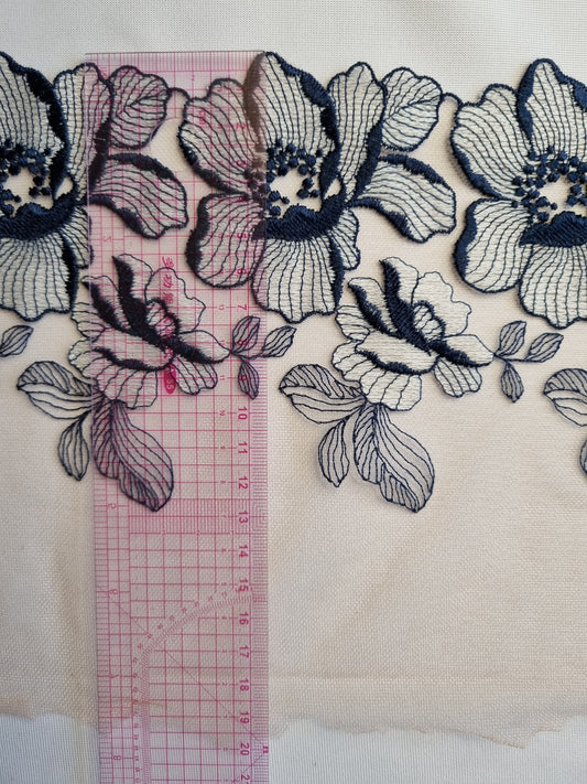 Beige kleurig tule kant met grote donkerblauw met wit geborduurde bloemen.