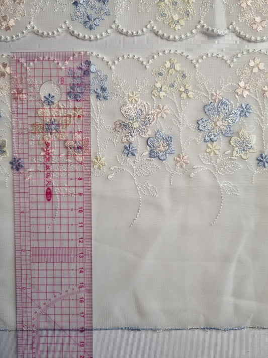 Geborduurd kant op geweven chiffon in crème wit met pastelkleurige bloemetjes