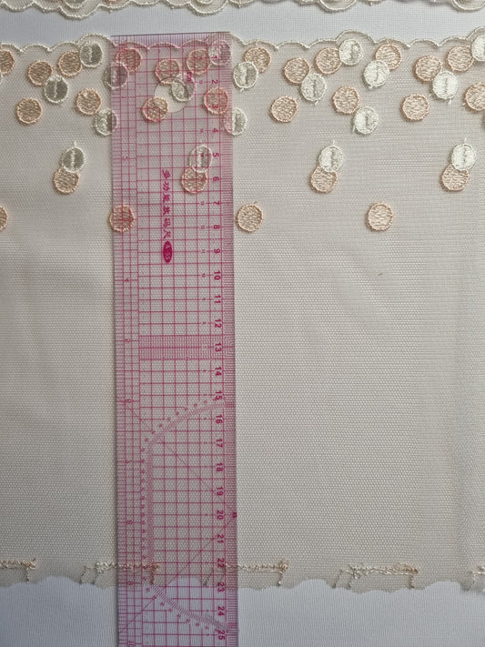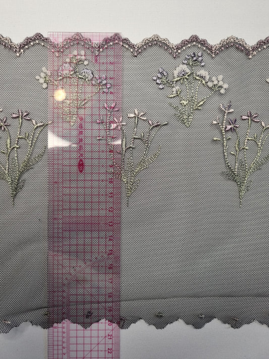 Zwart tule kant met geborduurde veldboeketjes on paarstinten