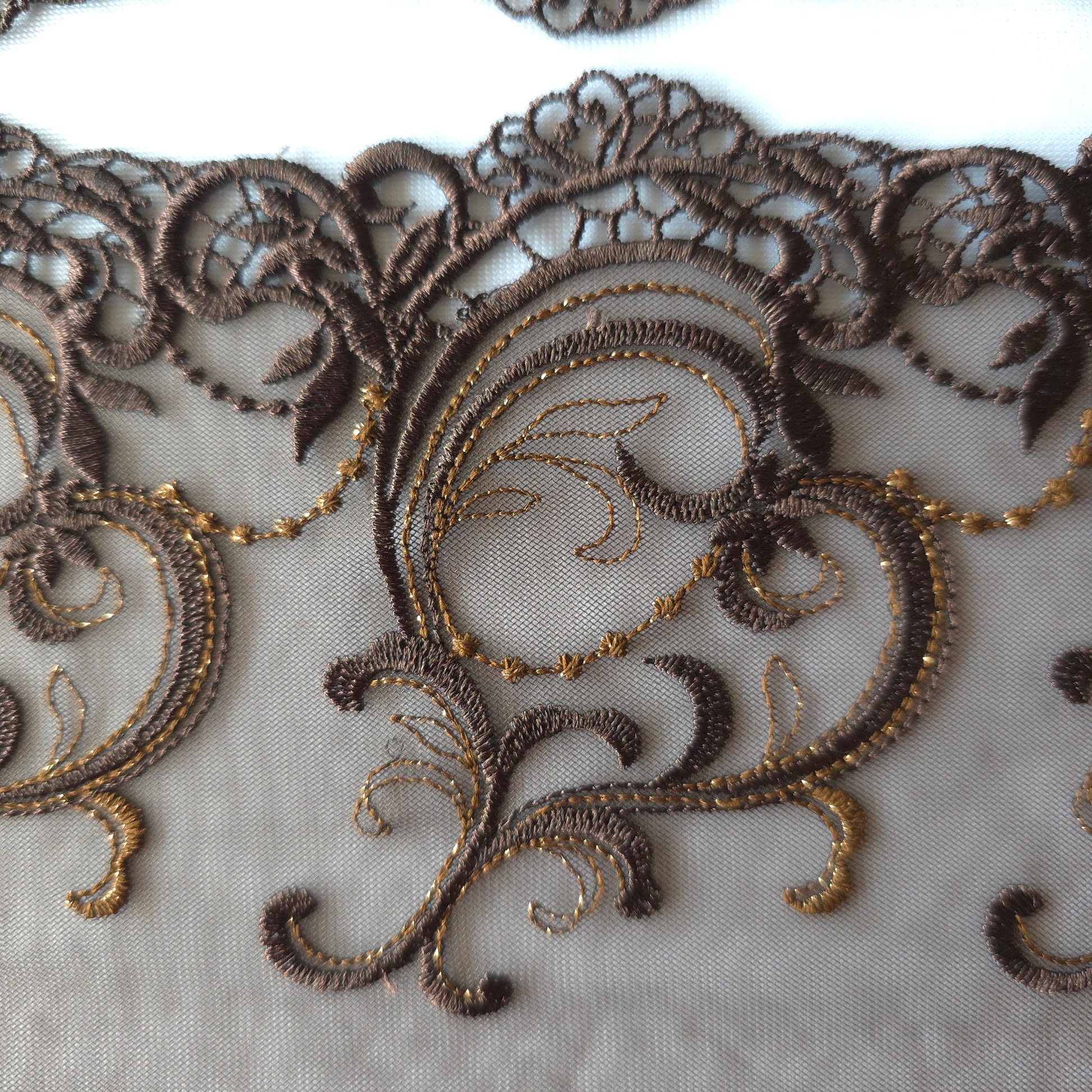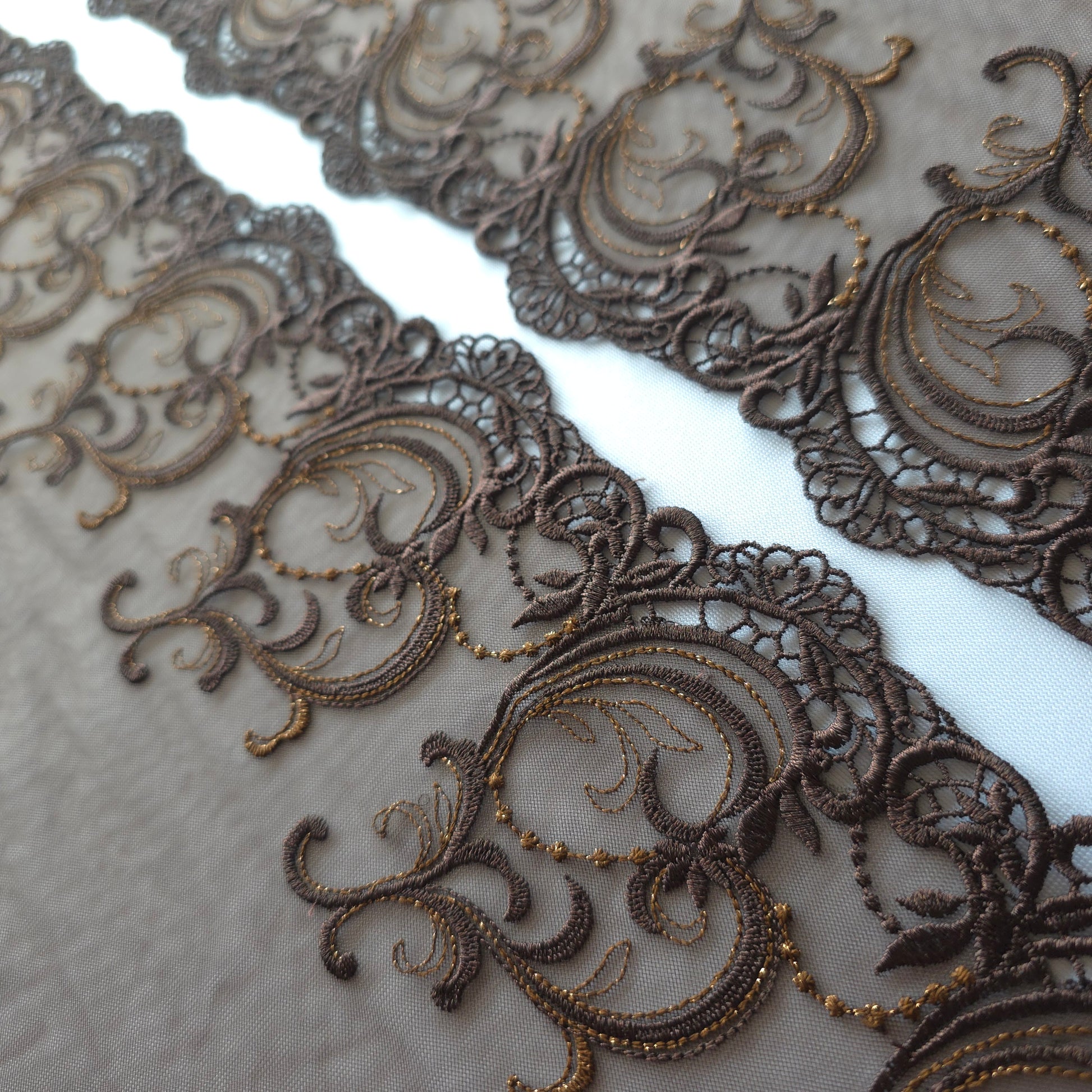 2025-110 chocolade bruin tule kant met guipure rand voorzien van bruin lurexdraad