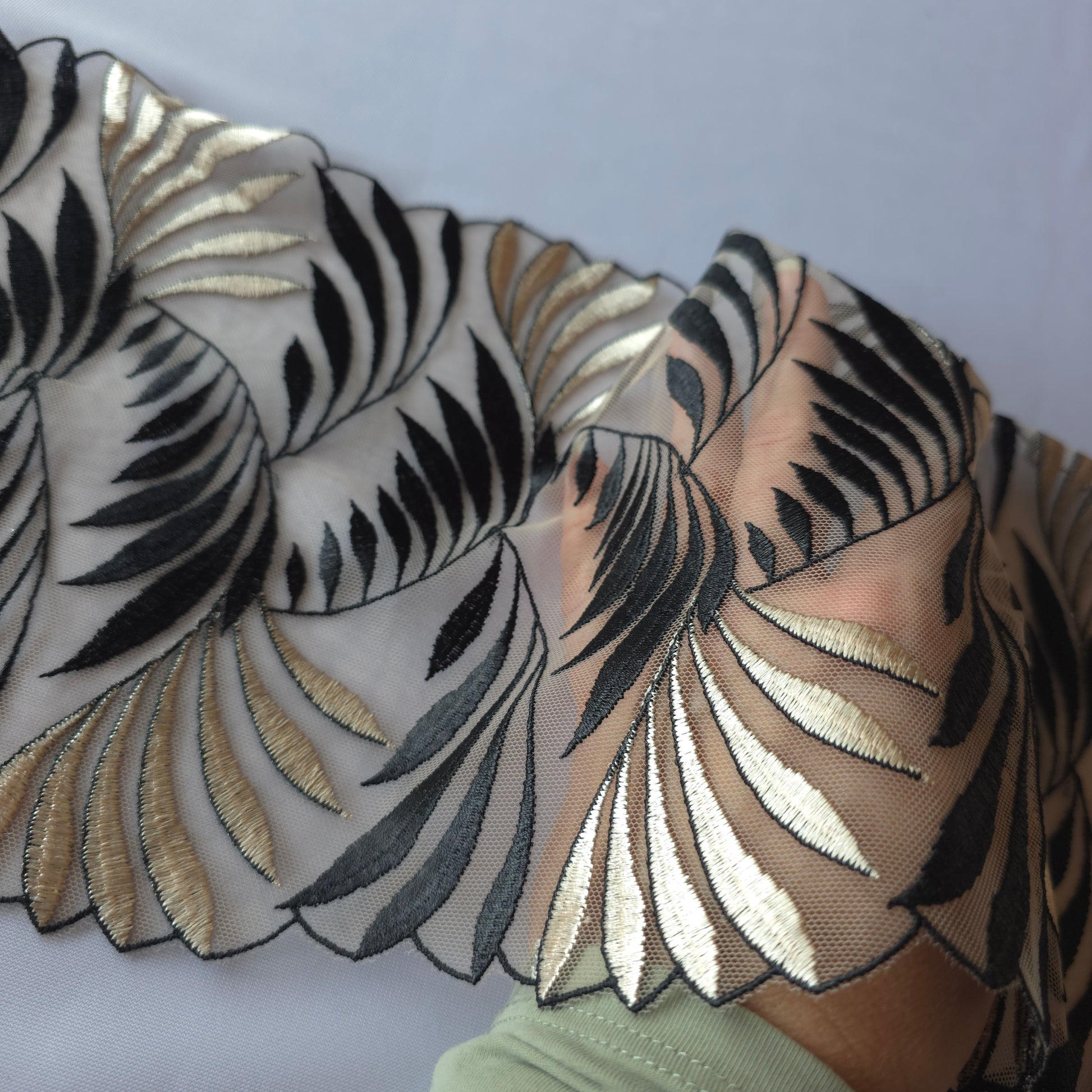 Dit gespiegeld, dubbelzijdig geborduurde kant is 20m breed en heeft geen rek.