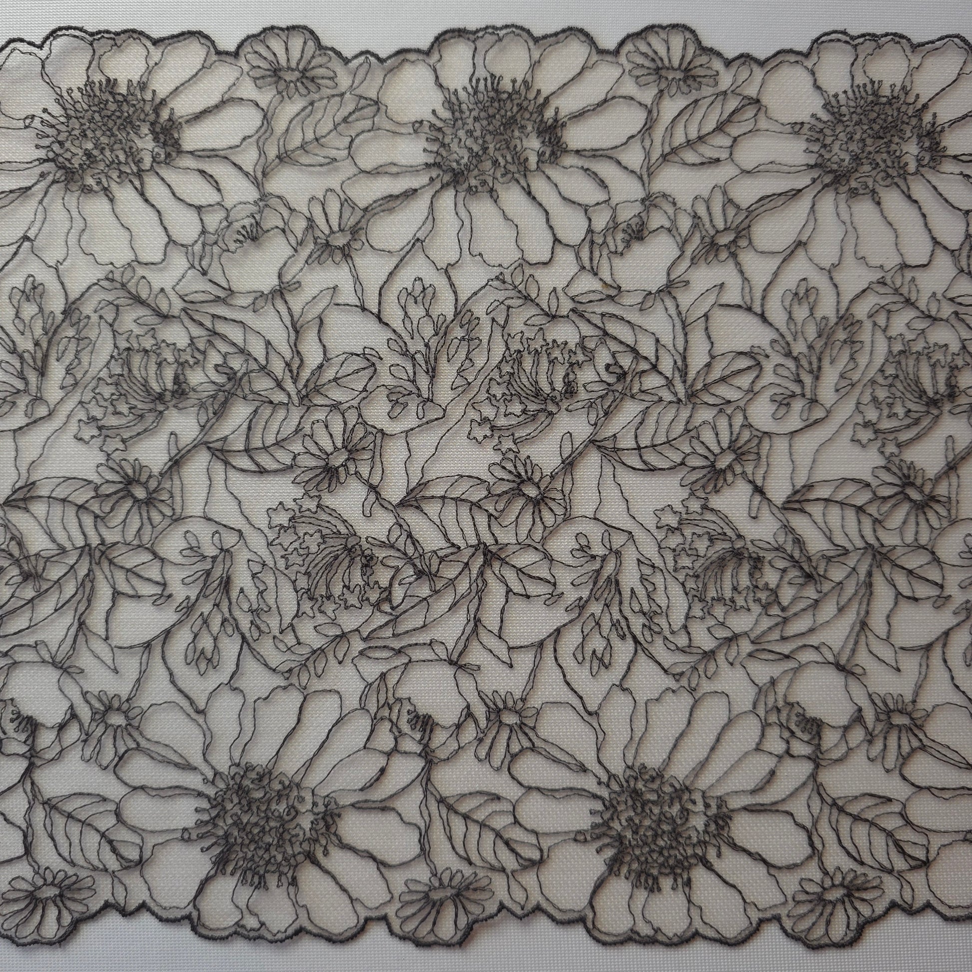 2025-121 delicaat beige tule kant met antraciet kleurig lineart bloemen borduursel