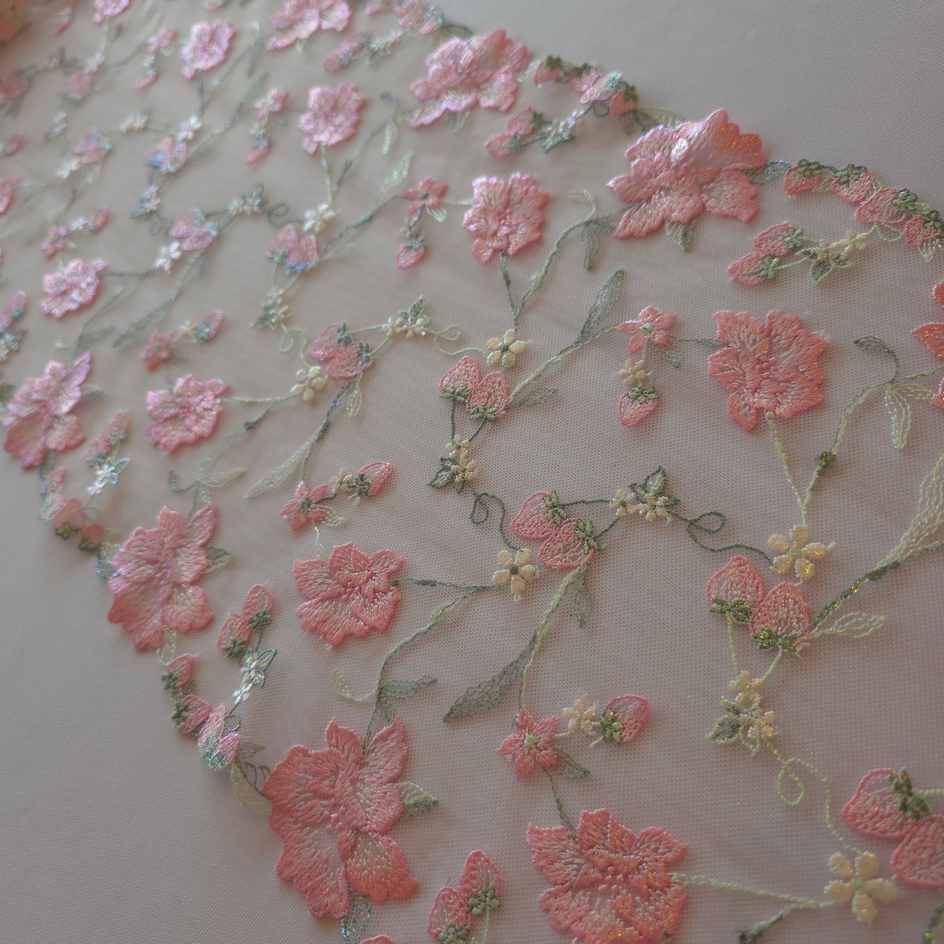 Dit kant in gespiegeld design, dubbelzijdig geborduurde randen is 24cm breed en heeft geen rek.