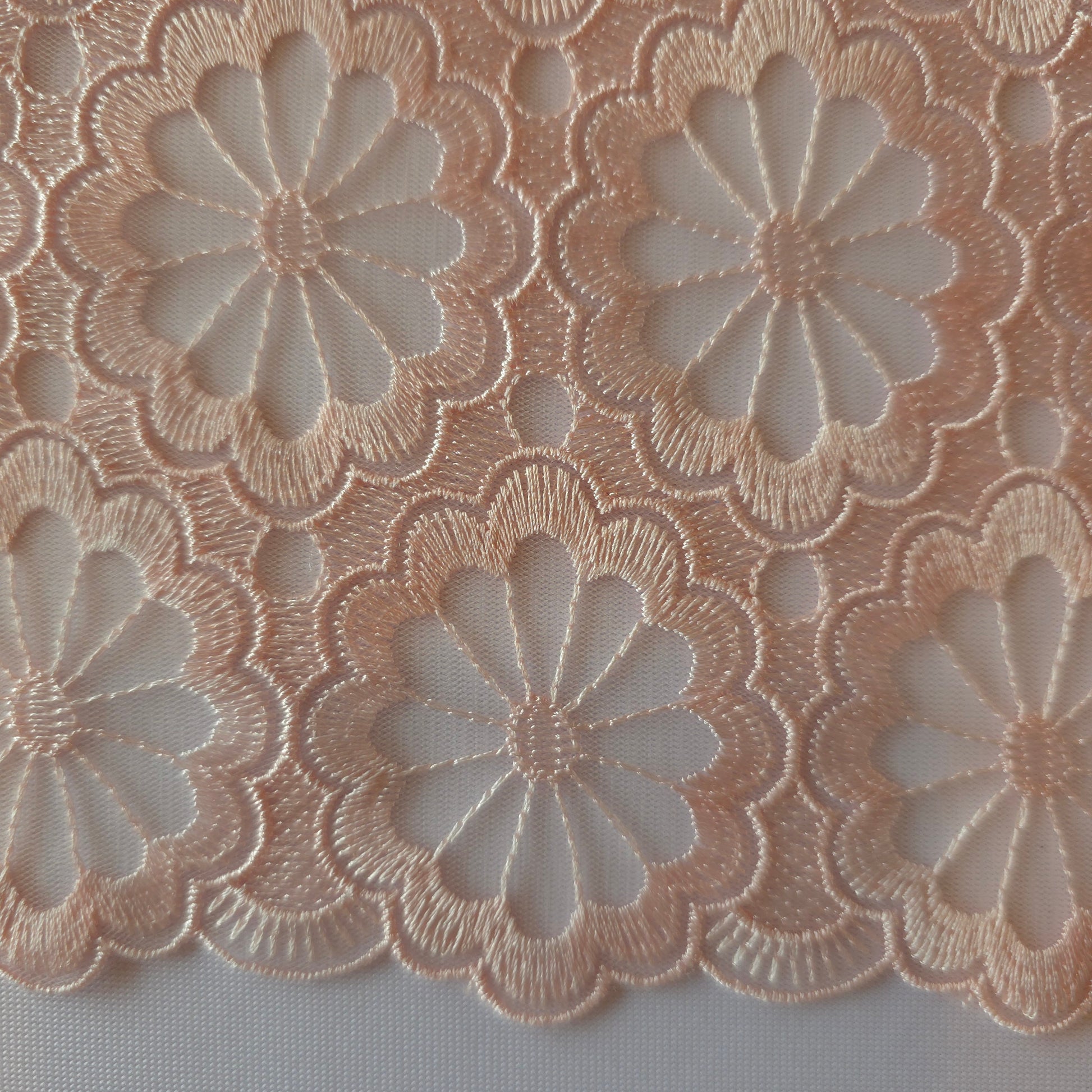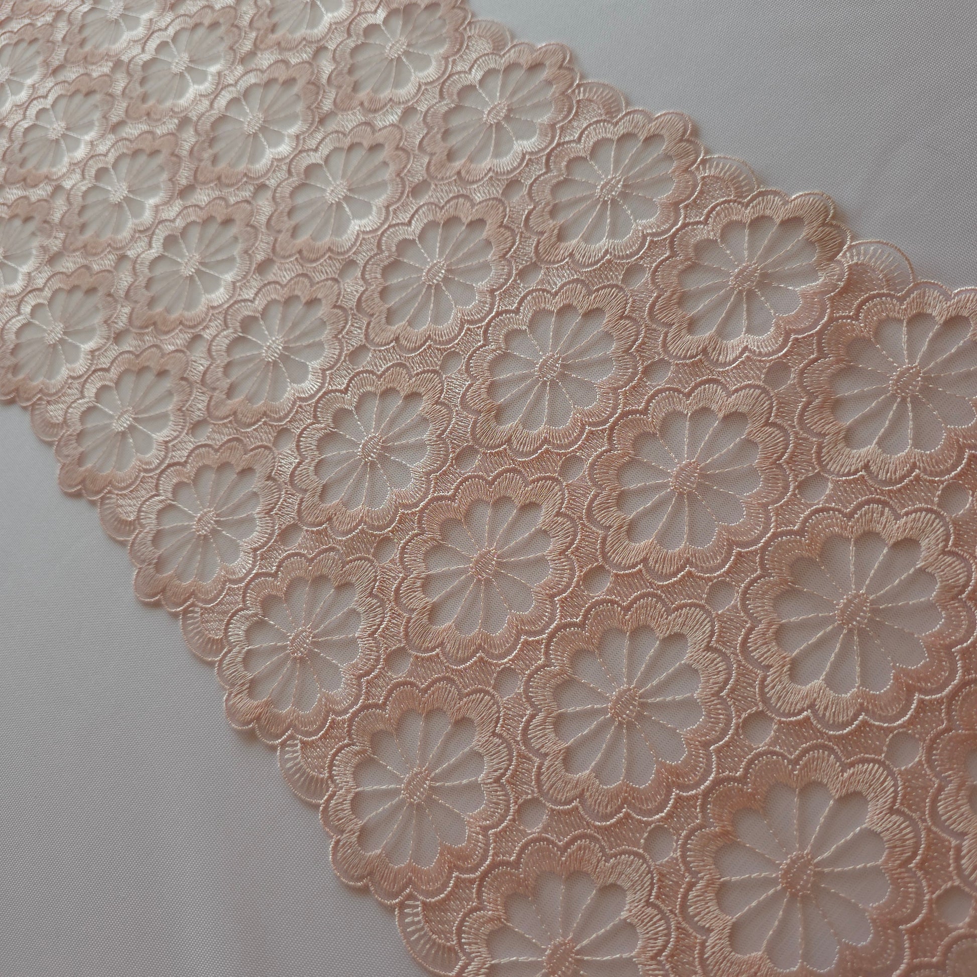 Dit kant in gespiegeld design, dubbelzijdig geborduurde randen is 21.5cm breed en heeft geen rek.
