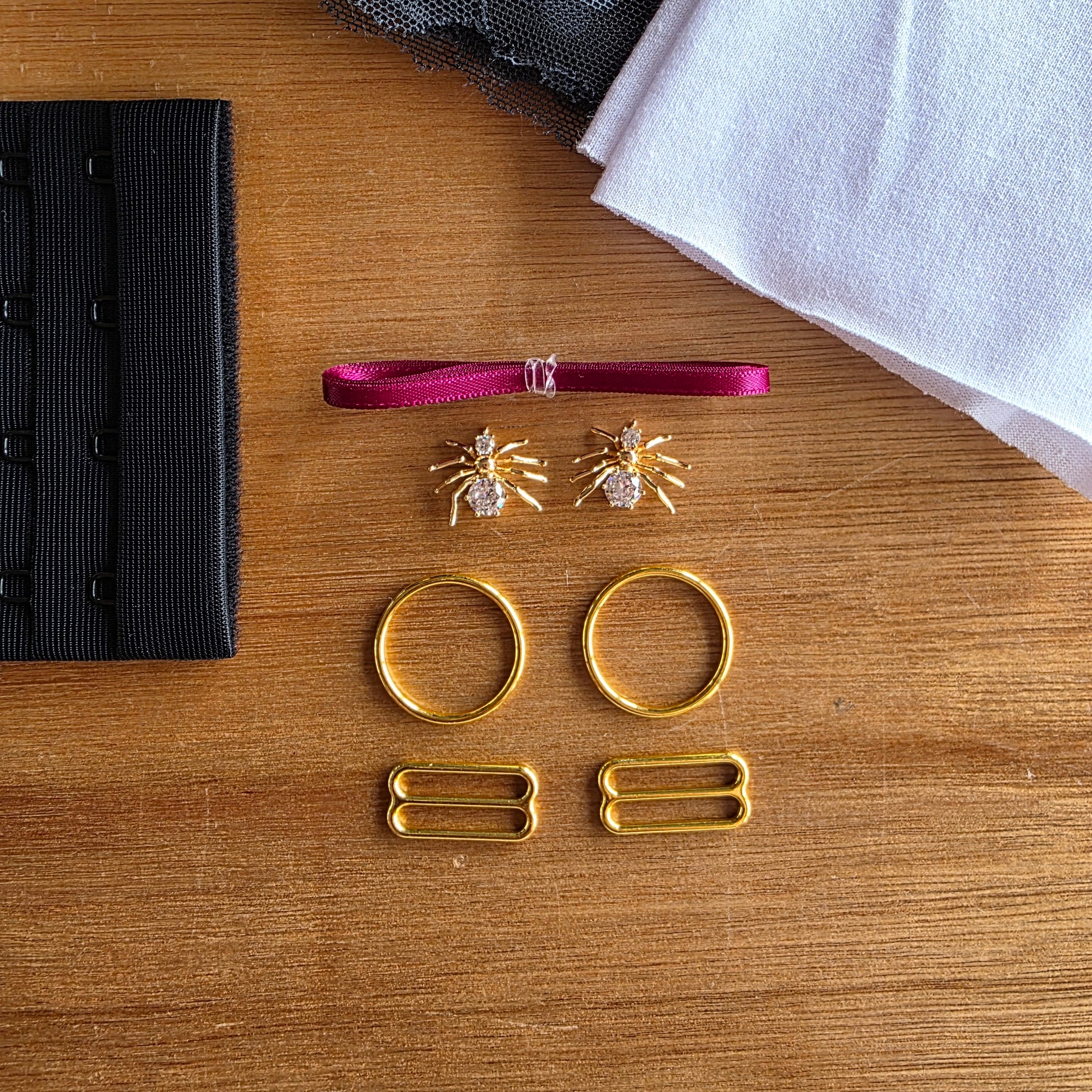 In deze kit vind je voldoende materiaal voor het maken van een BH + slip. Check altijd eerst je te gebruiken patronen of de inhoud van de kit overeenkomt met de materialen die je nodig hebt. Wat er niet in de kit zit zijn garen, beugels en patronen.