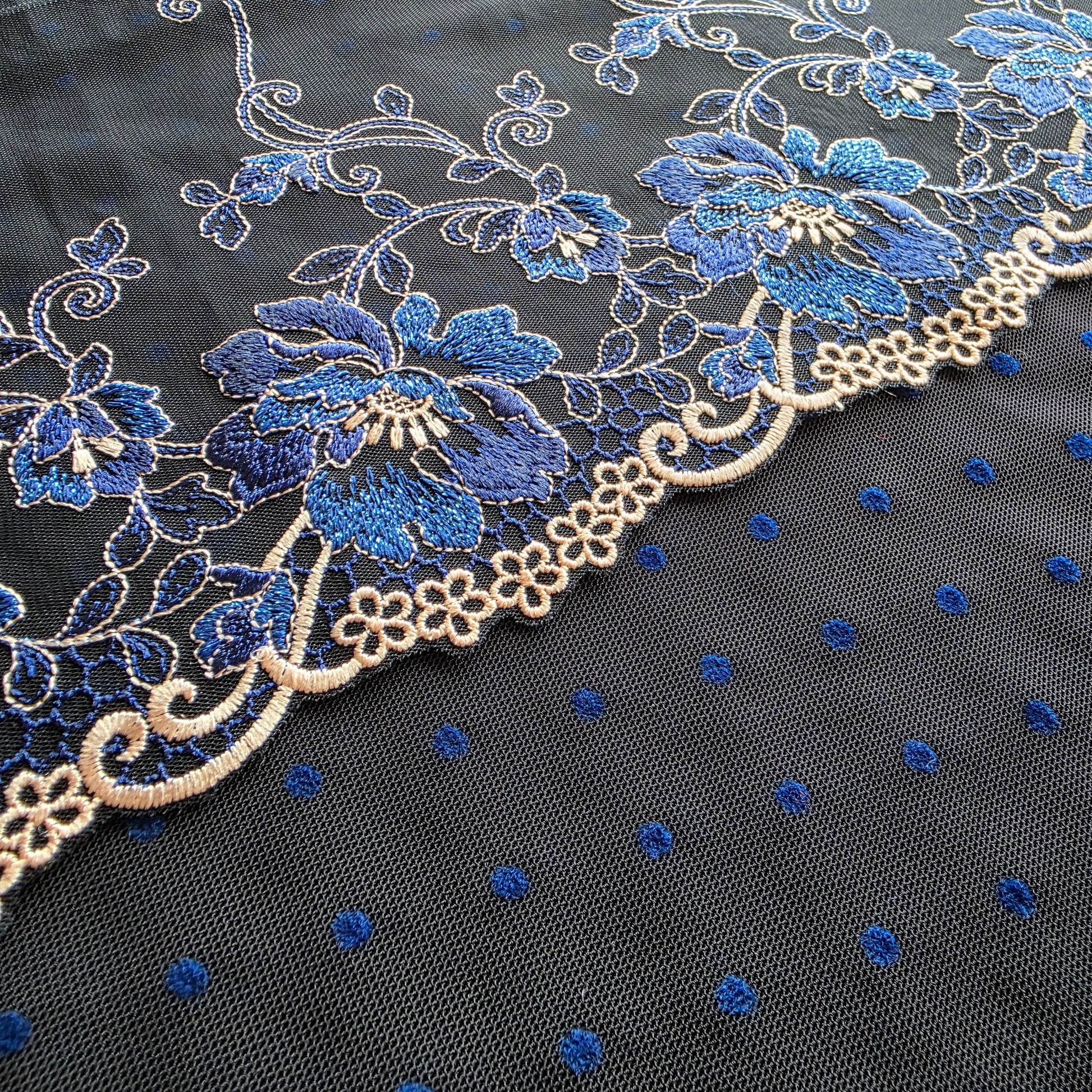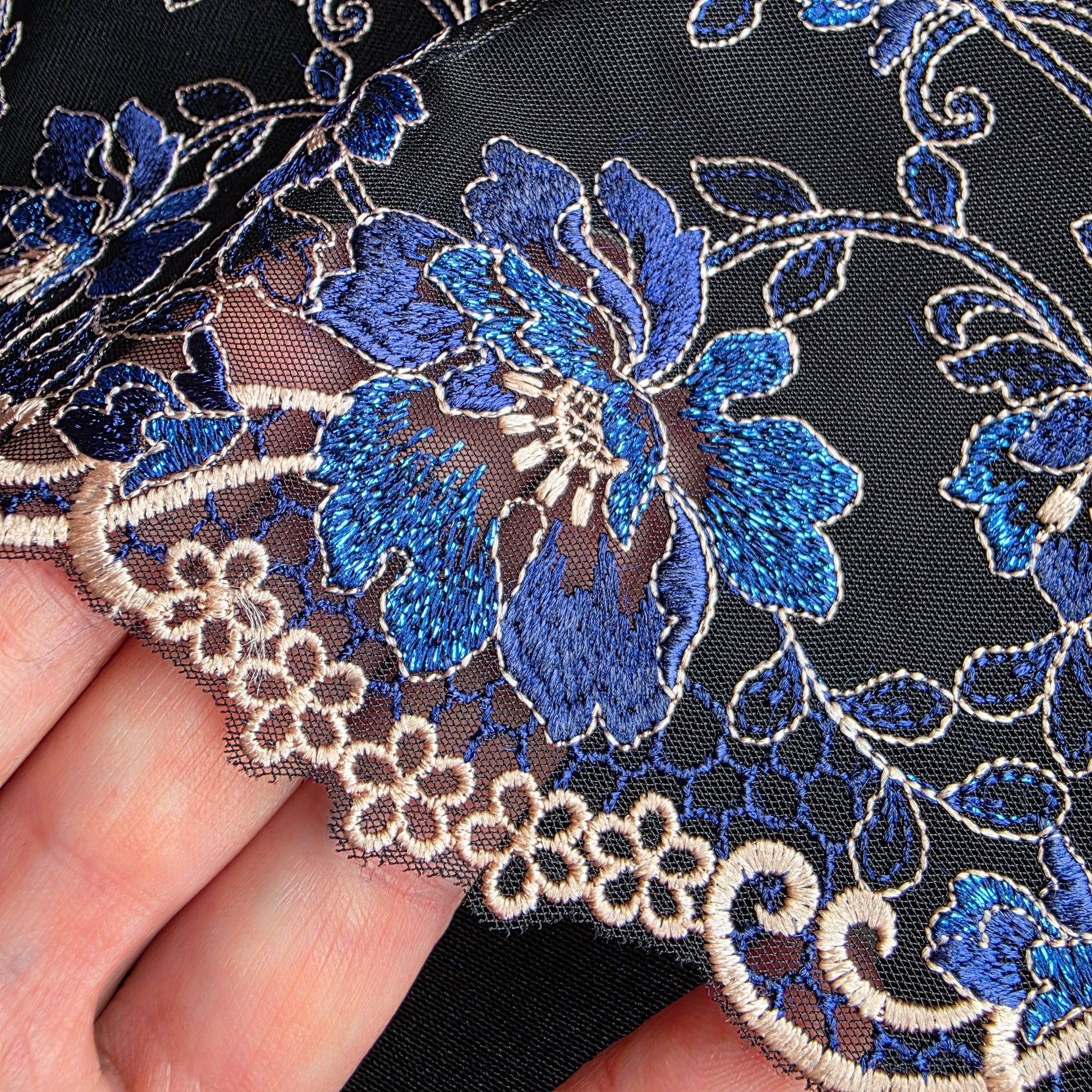 - 32cm x 1,5m dubbelzijdig geborduurd kant met wat mechanische rek in de hoogte voorzien van blauw lurexdraad. (meer kant nodig? Klik op de link: 2024-4 zwart tule kant met blauwe bloemen – Suzanne's Lingerie Supplies )
