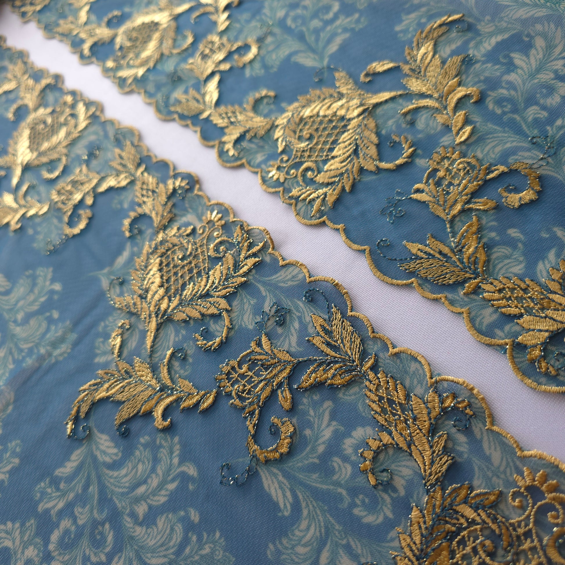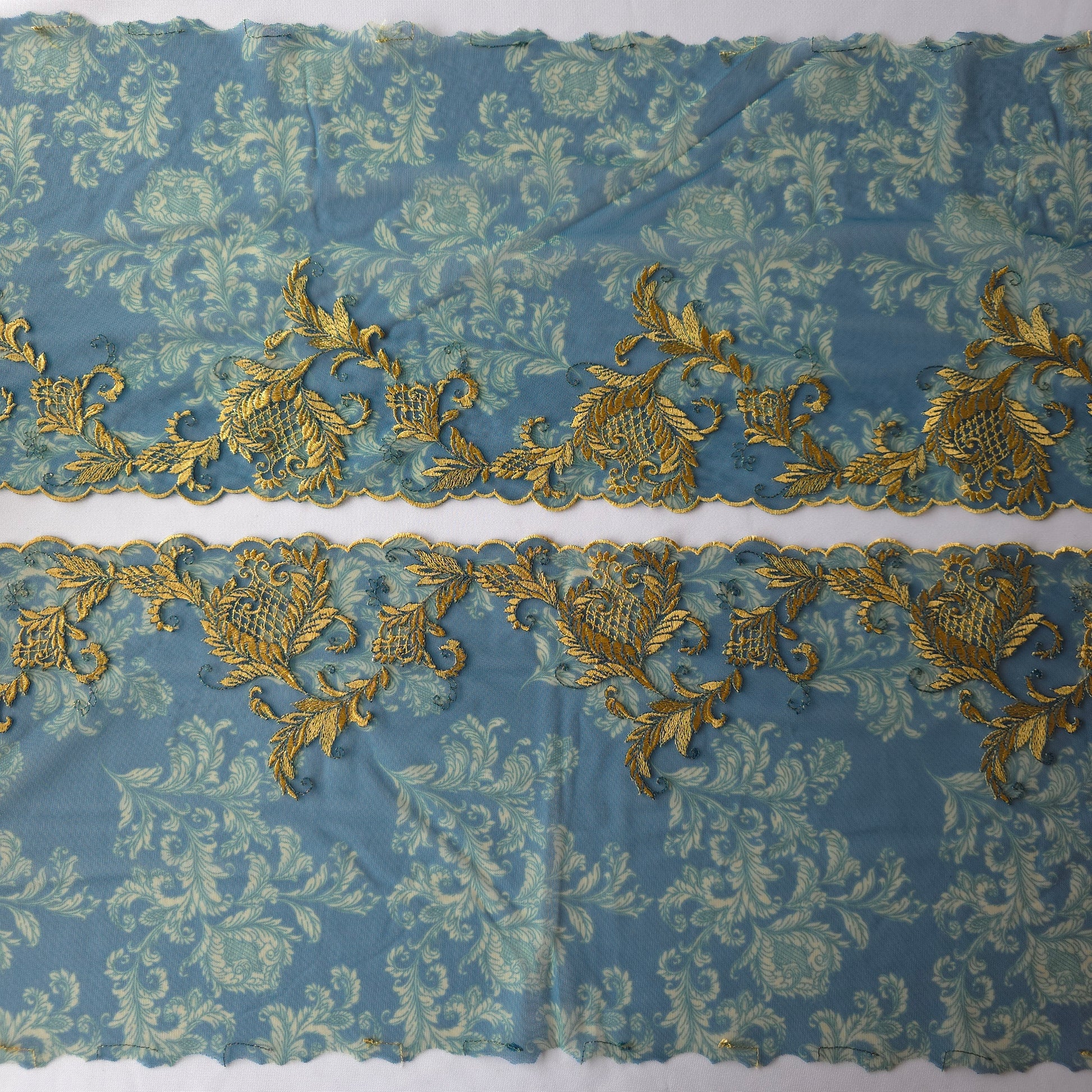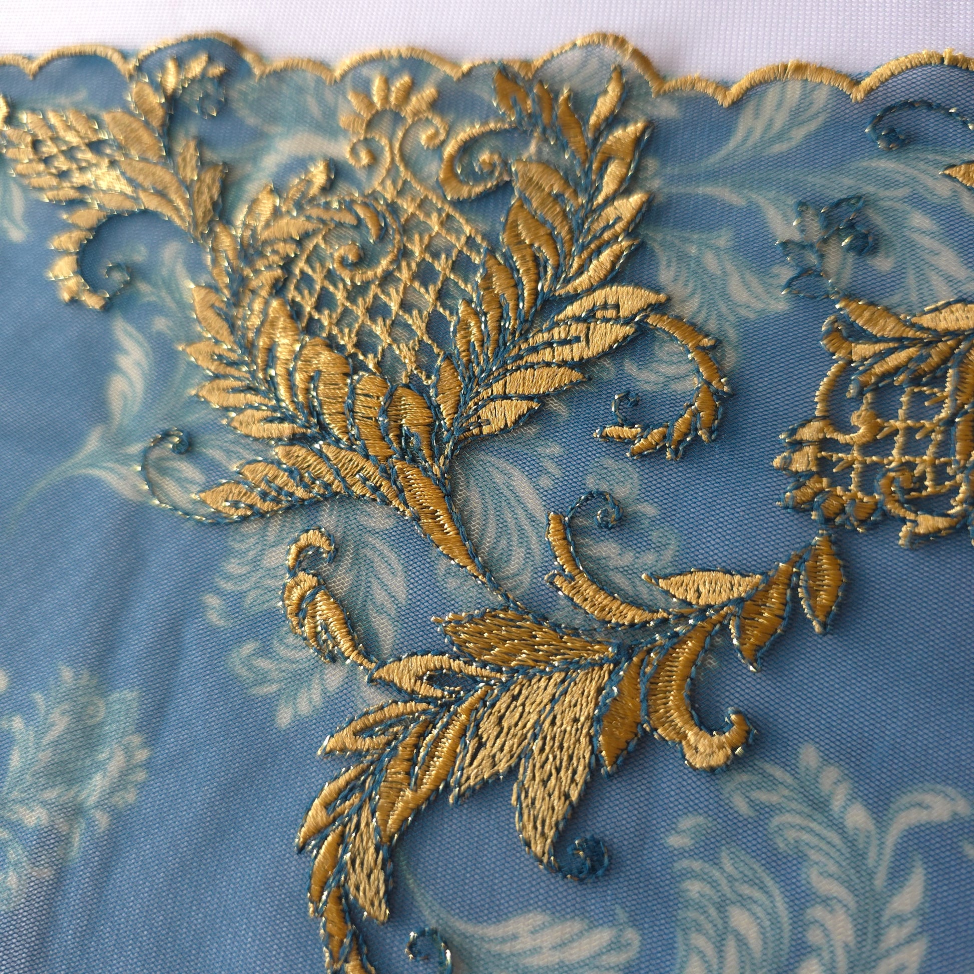 2025-104 Petrol groen tule kant met print en borduursel in Art Nouveau stijl voorzien van goudkleurig lurexdraad