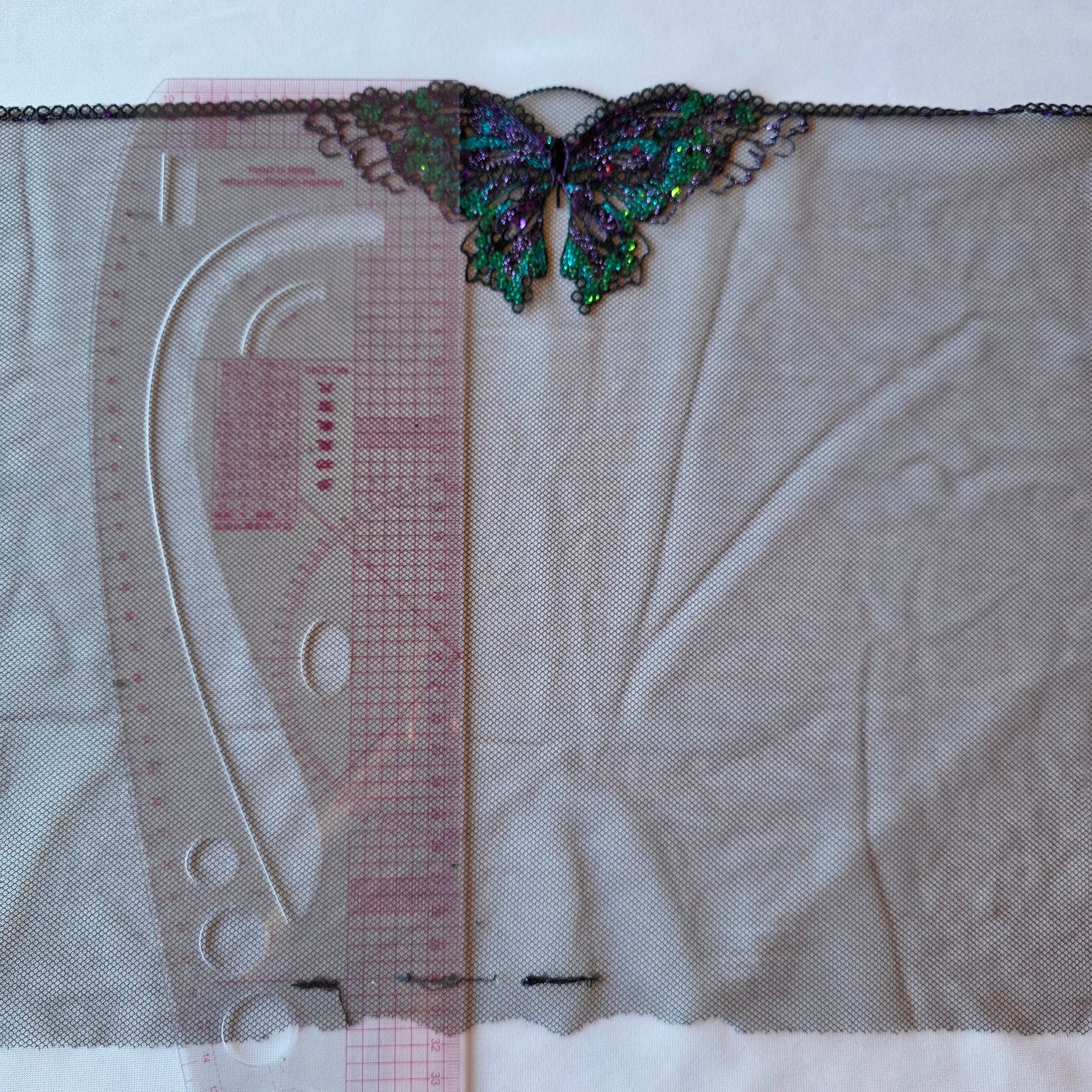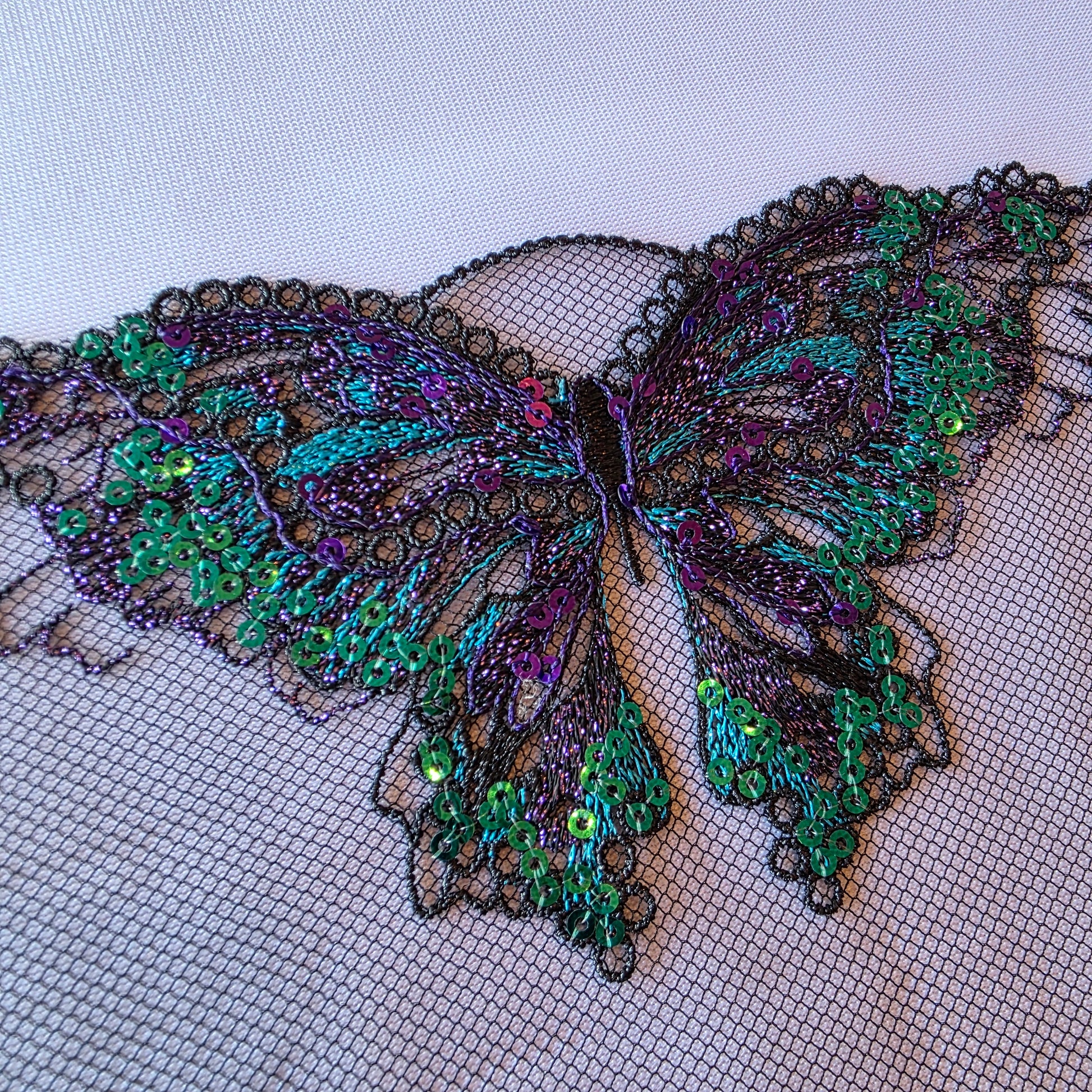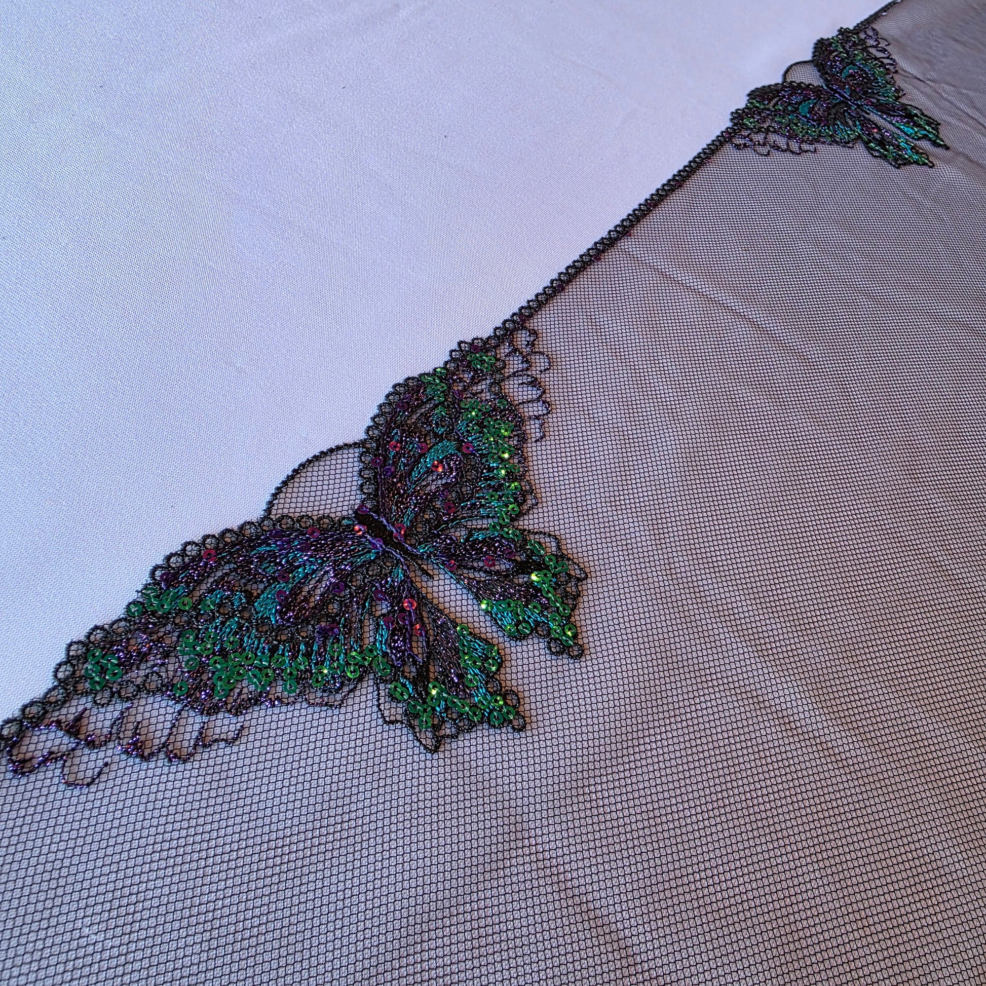 2025-83 Zwart tule kant met geborduurde vlinders voorzien van pailletten.