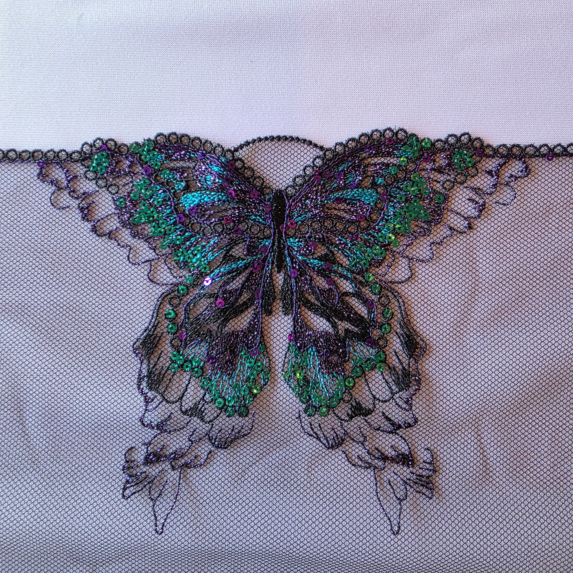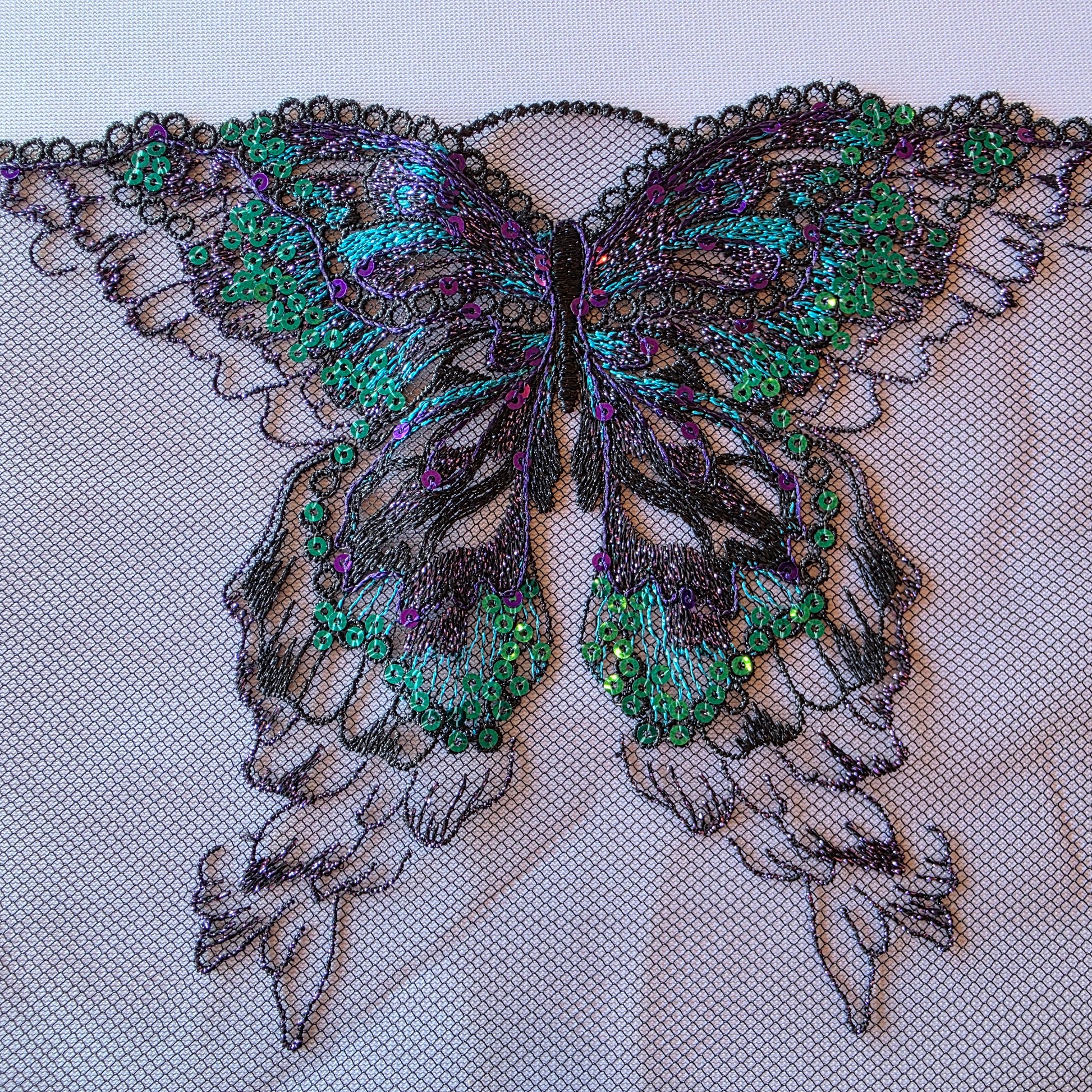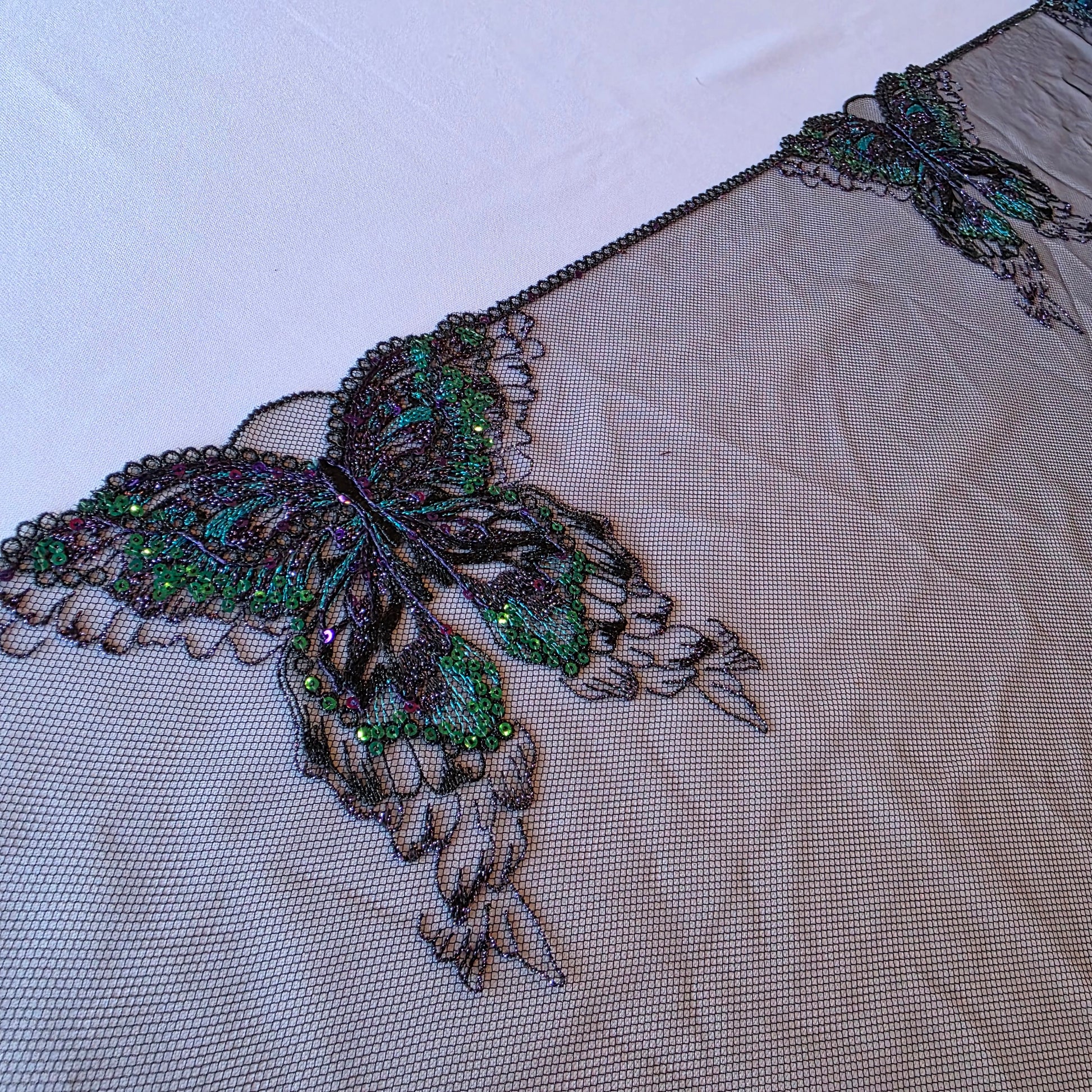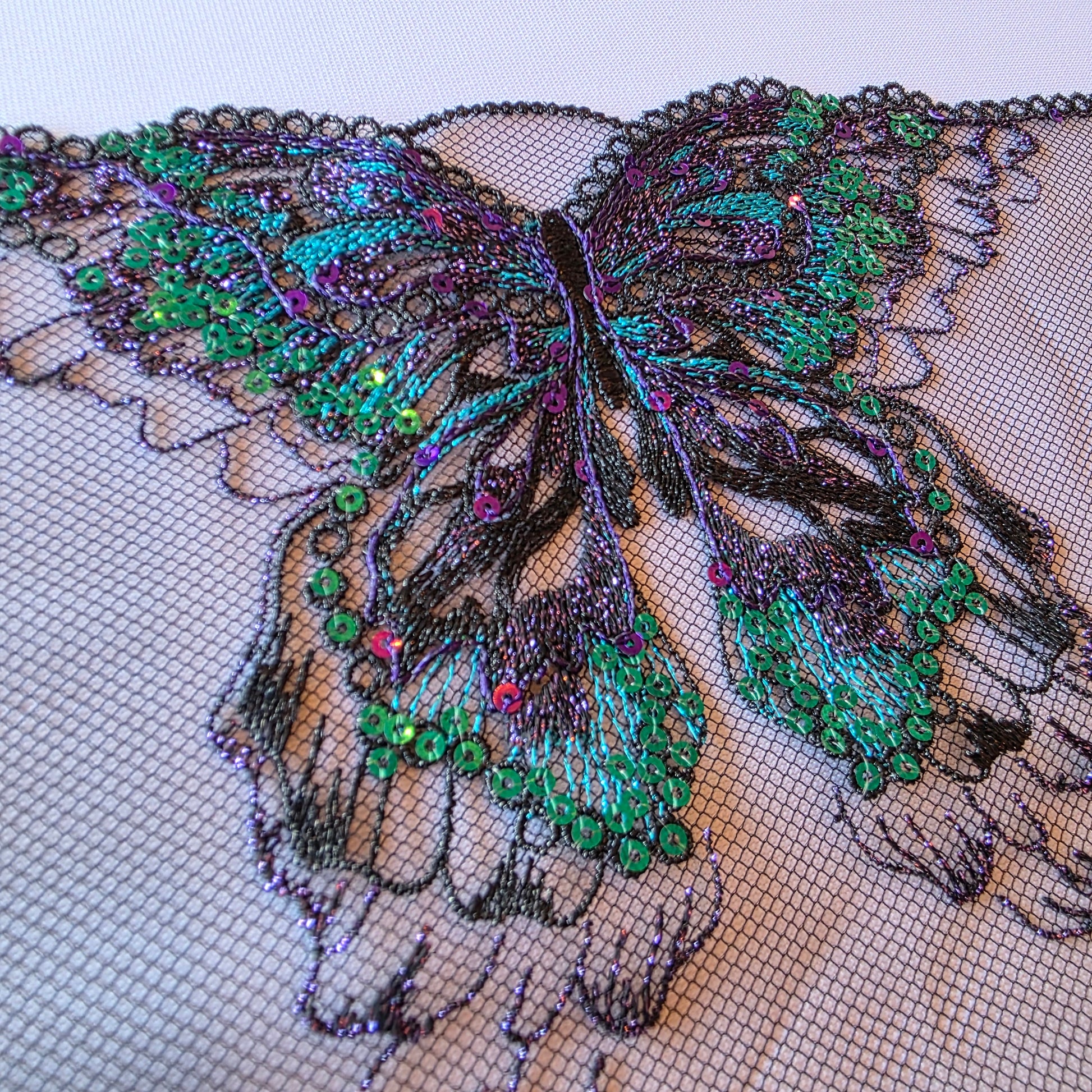 2025-84 Zwart tule kant met geborduurde vlinders voorzien van pailletten extra groot
