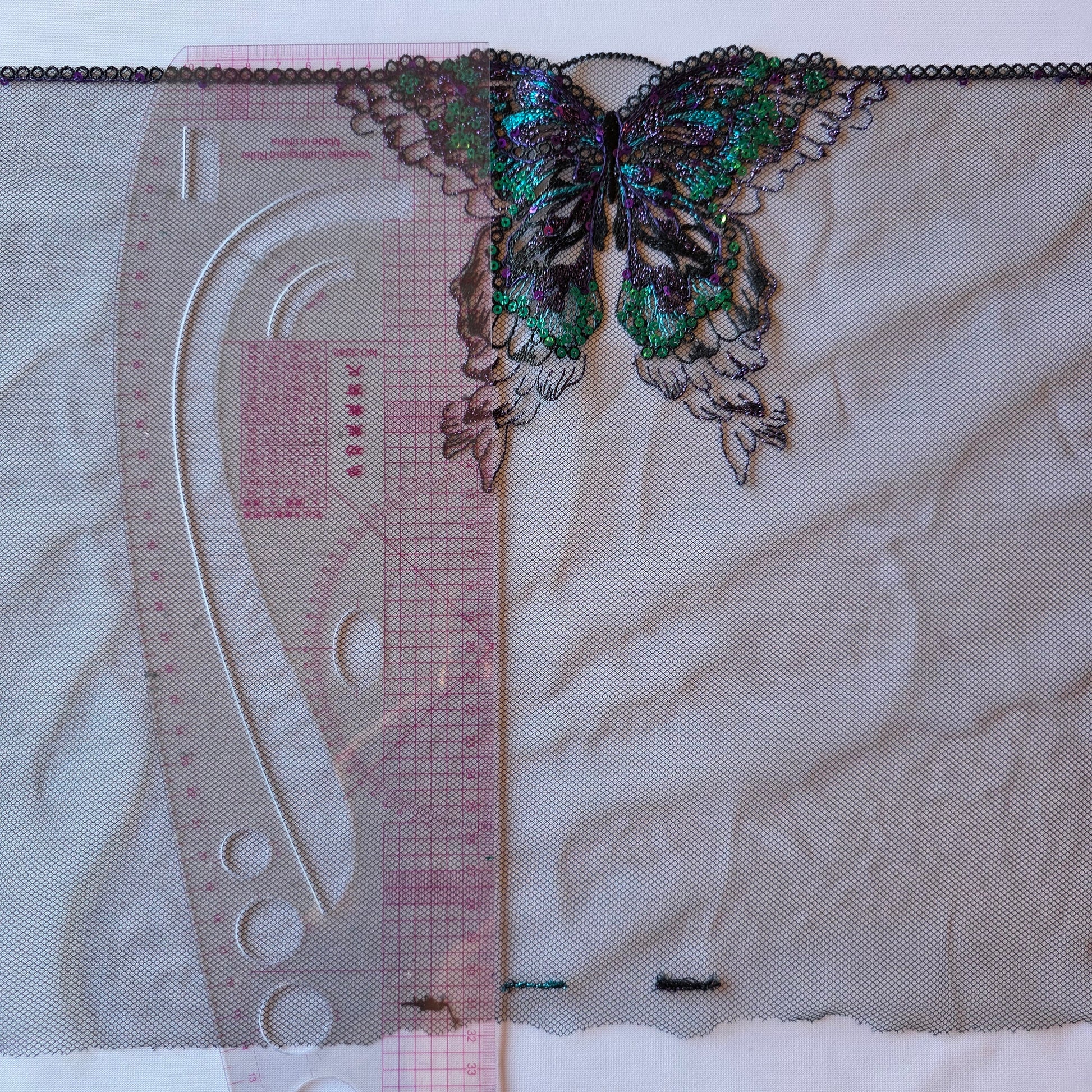 Dit tule kant heeft een klein beetje mechanische rek in de hoogte en is 31cm breed. Gezien de wijze waarop dit kant geproduceerd is, kan deze niet aan langere stukken dan 1,30m geleverd worden. Op 1 stuk staan 4 vlinders