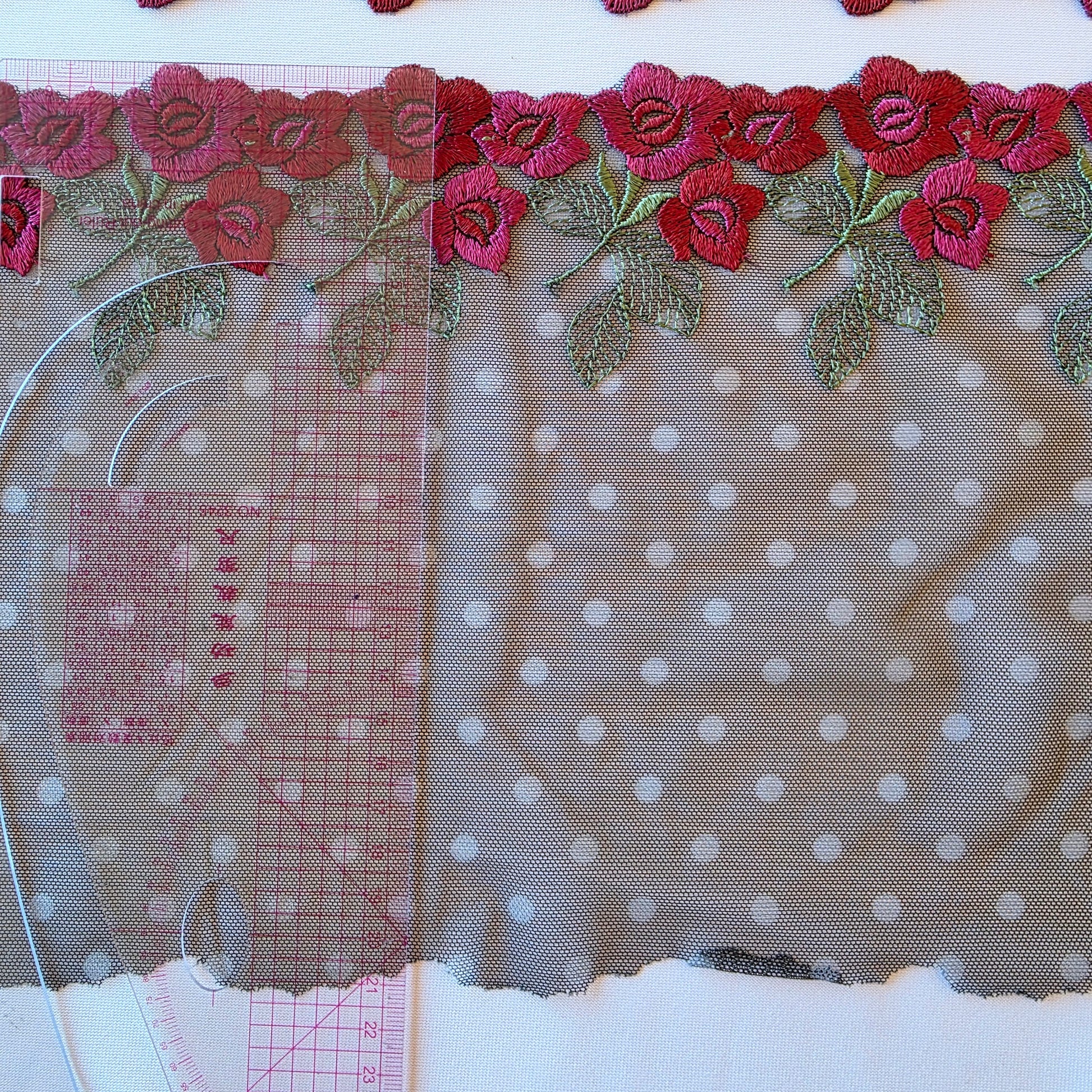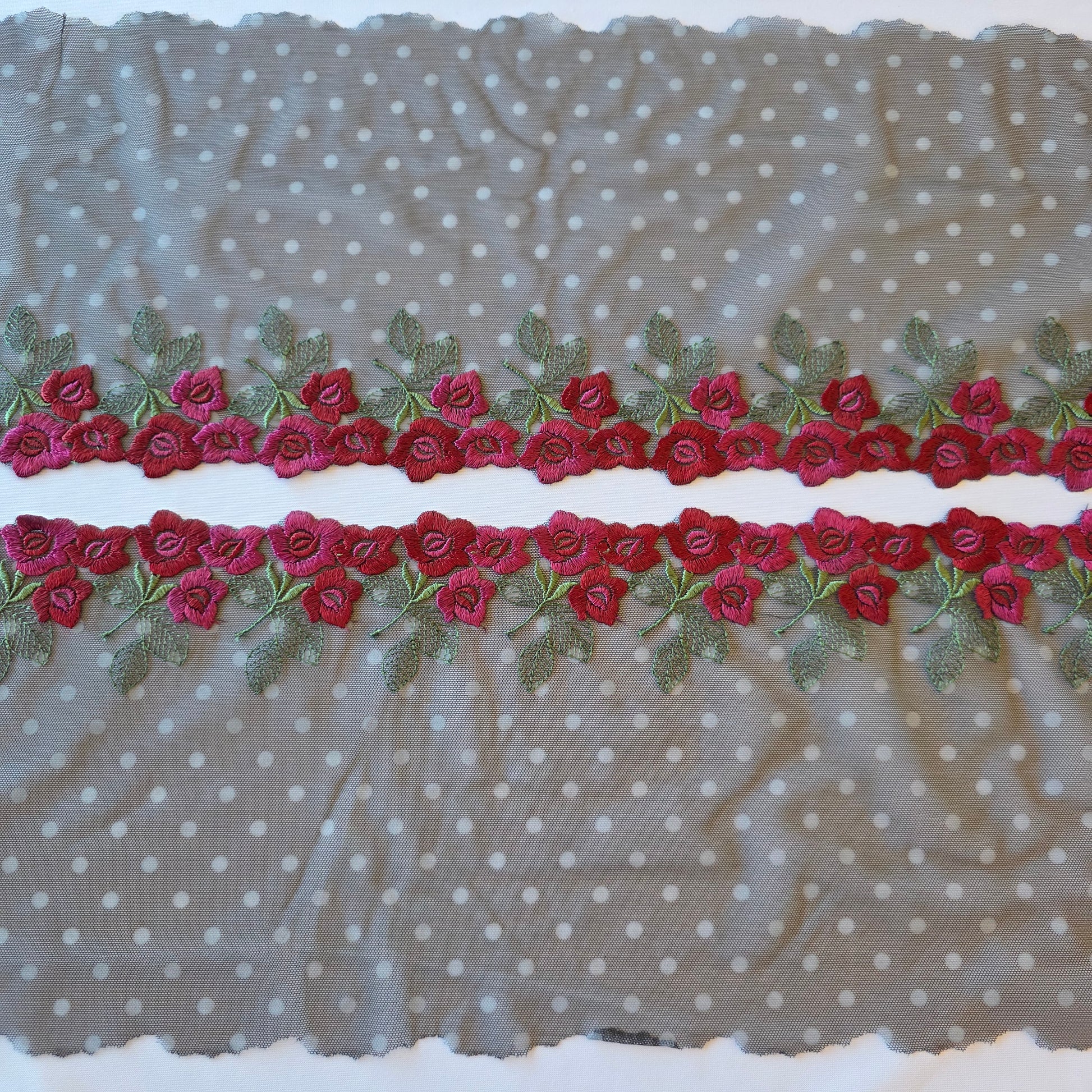 2025-89 zwart tule kant met witte, geprinte polka dot en bordeaux rode, geborduurde roosjes