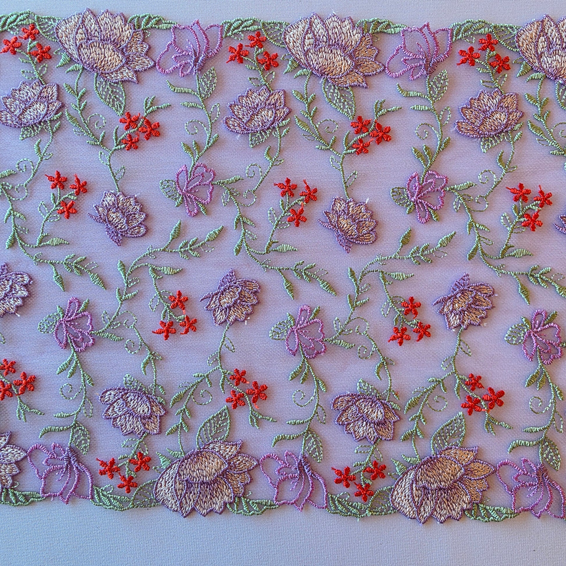 2025-91 lila tule kant met all over geborduurde bloemen in paars en oranjerood