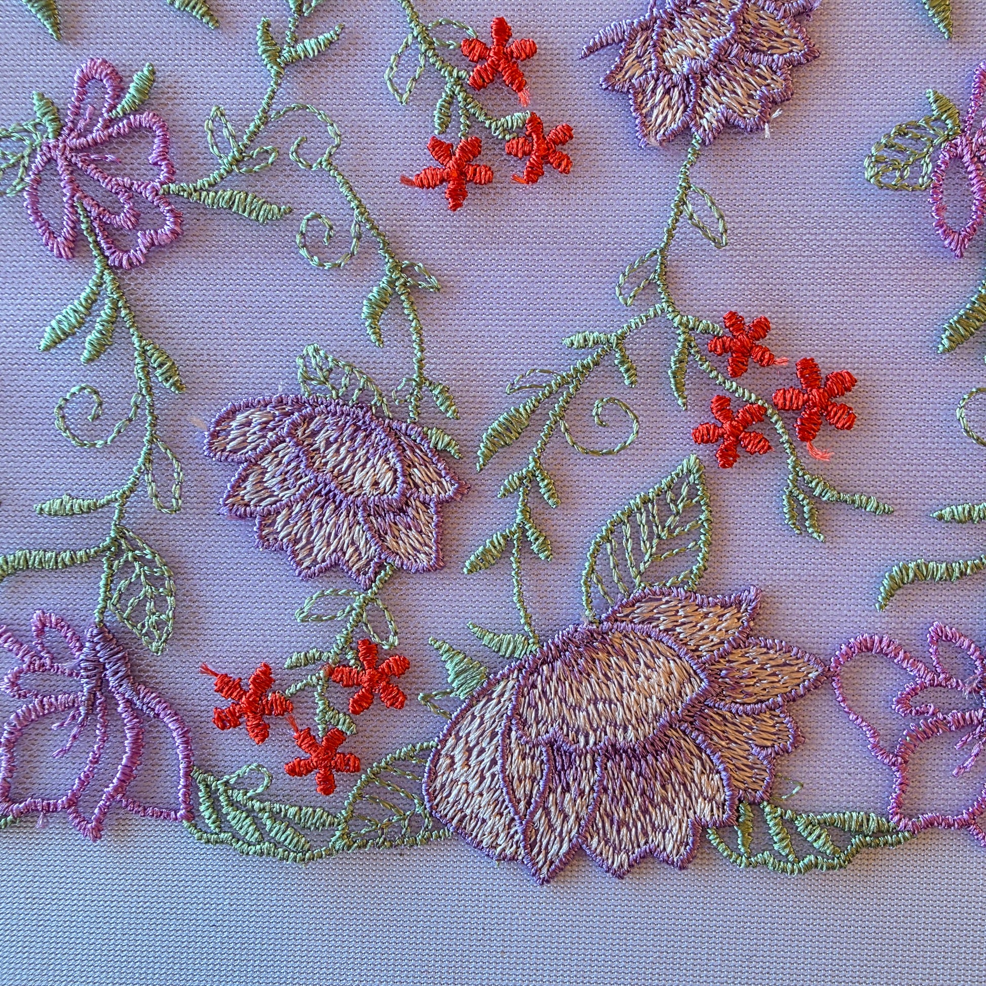 Dit gespiegeld, dubbelzijdig geborduurde kant is 22.5m breed en heeft mechanische rek in de hoogte