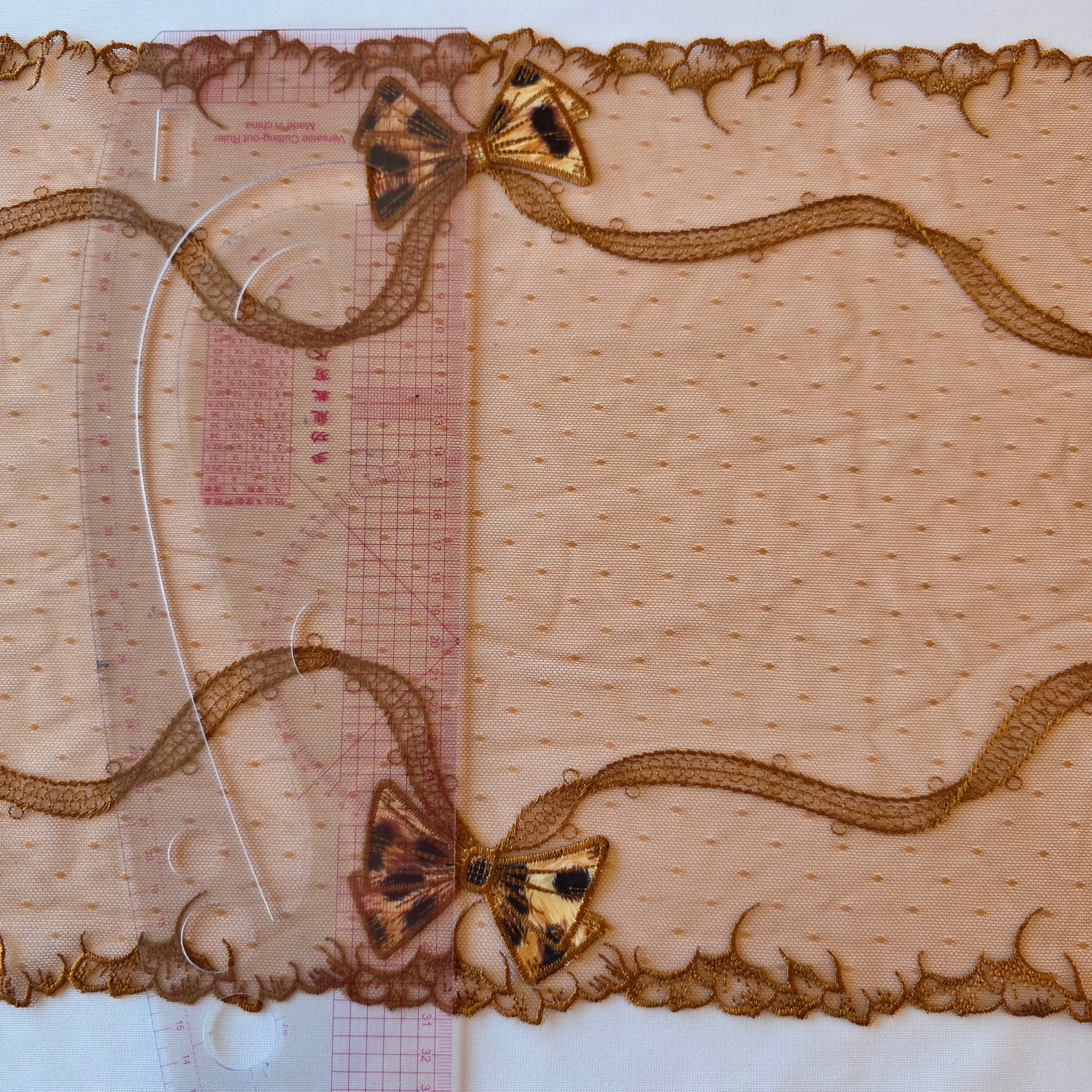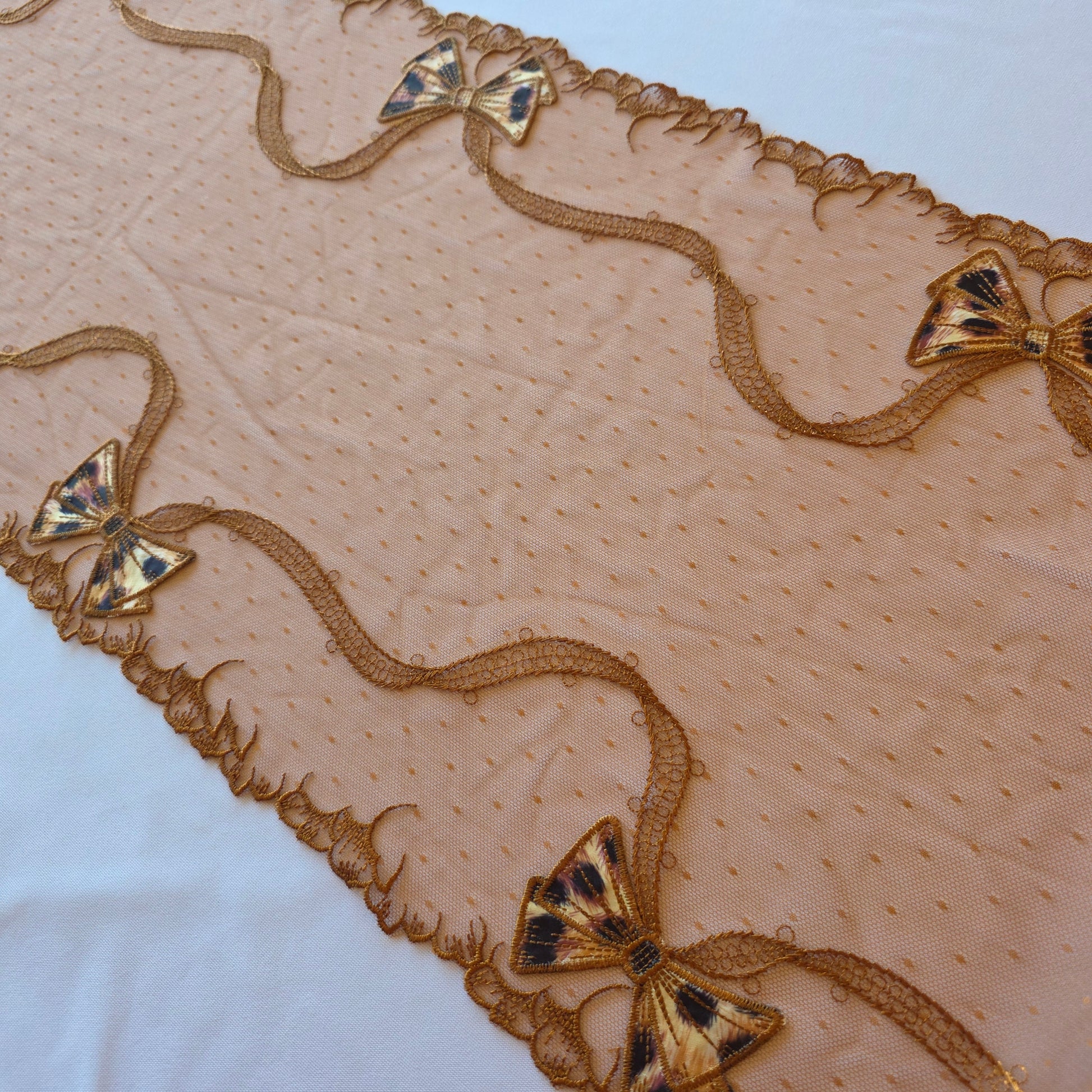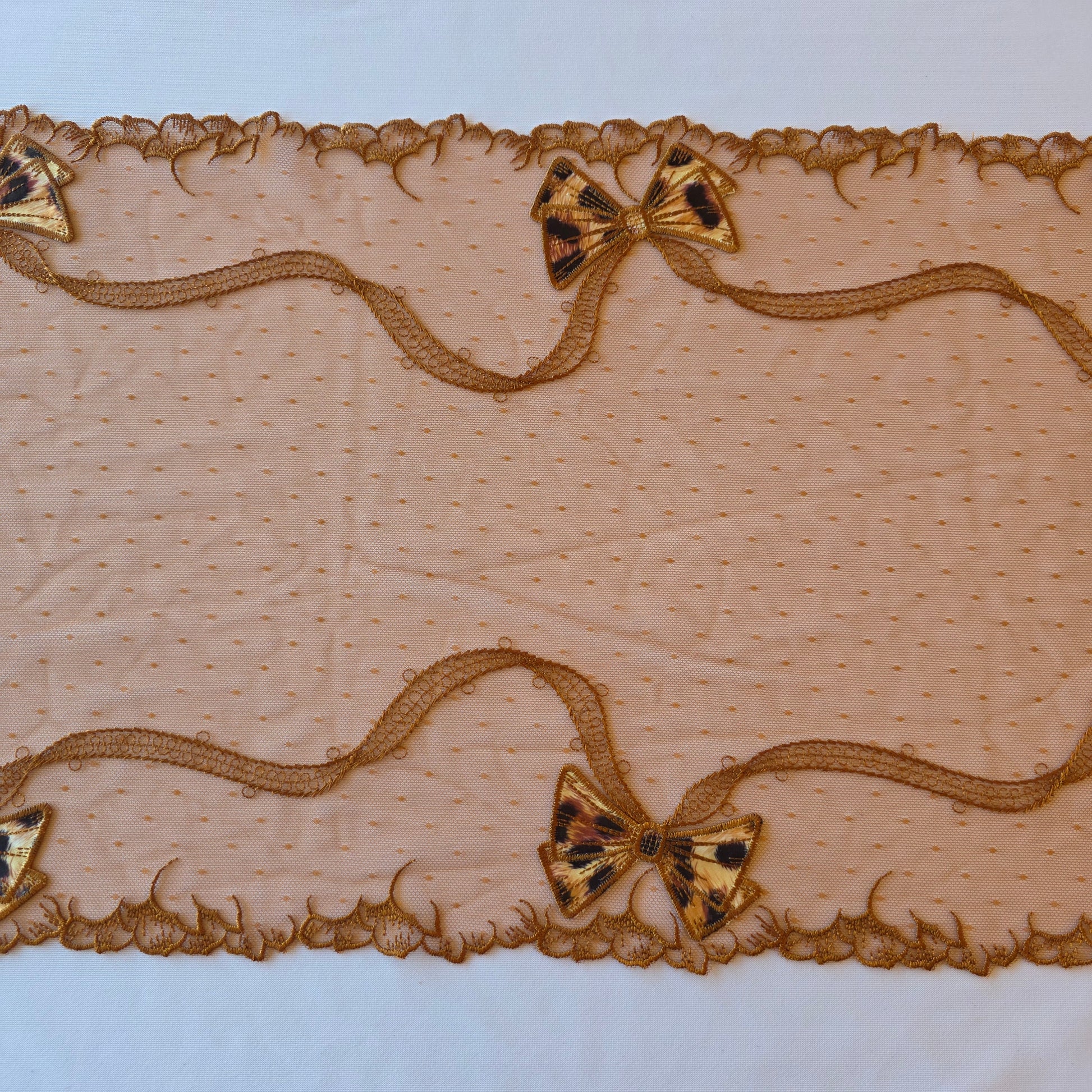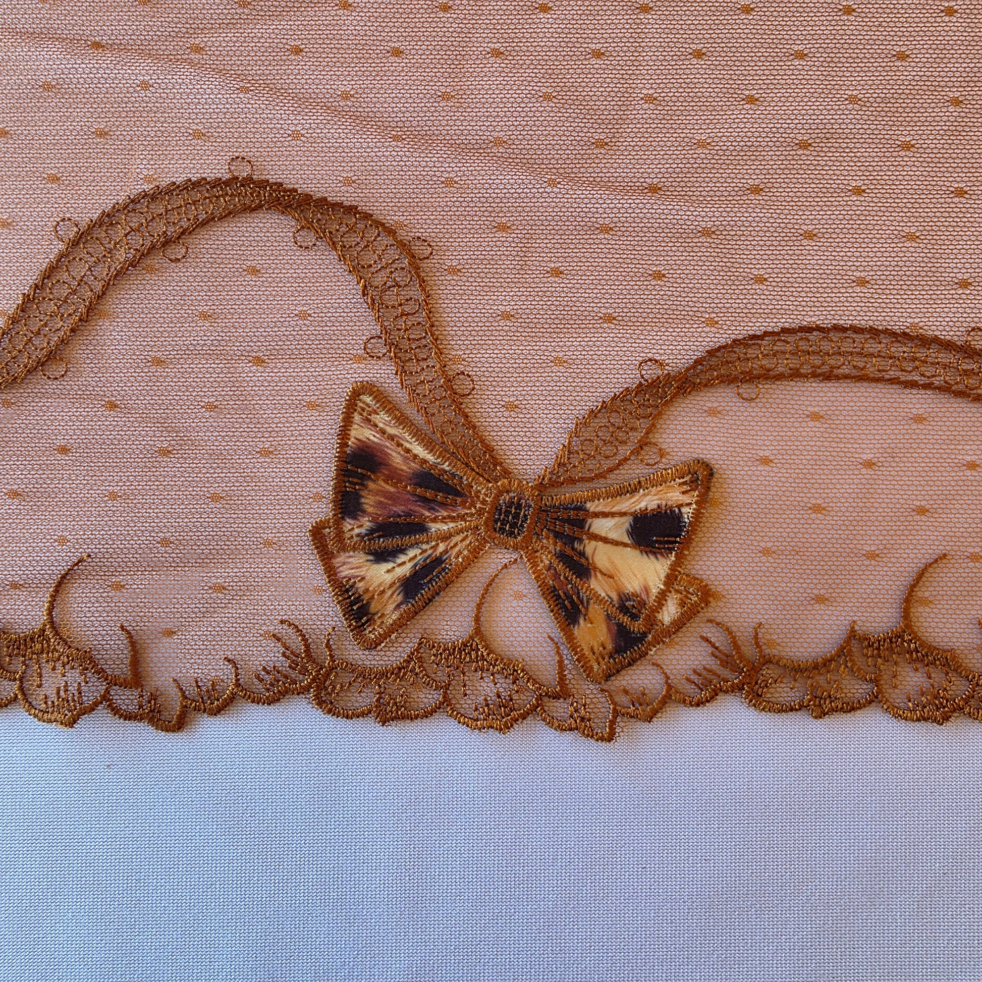 2025-94 kaneelbruin tule kant met geappliqueerde strikjes in panterprint