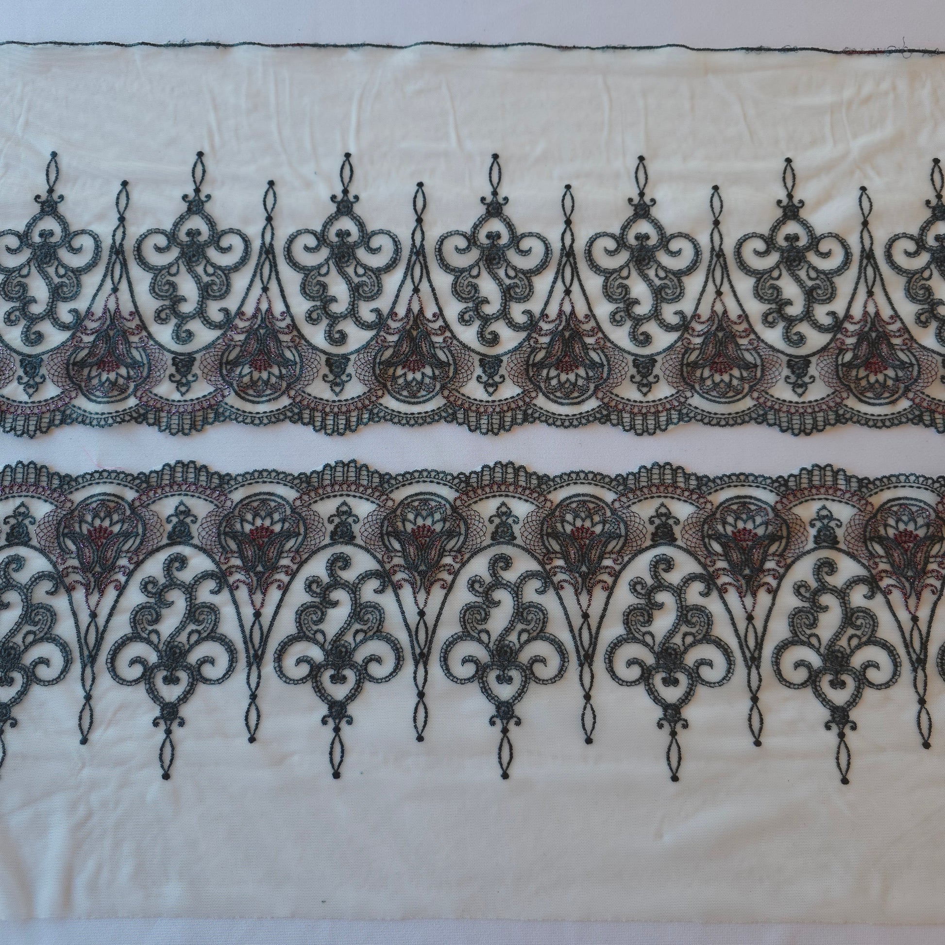 Dit geborduurde stretchkant is 21,5cm breed en bestaat uit links en rechts (gespiegeld) kant